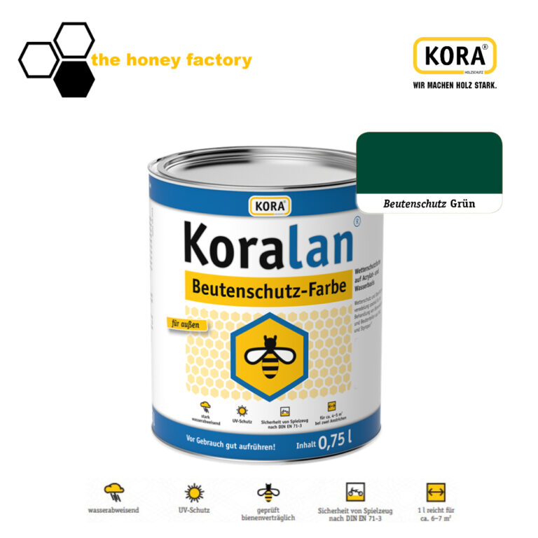 Sorge für den optimalen Schutz deiner Beutensysteme mit der PREMIUM Koralan Beutenschutz-Farbe Grün. Dieses erstklassige Produkt bietet herausragenden Witterungsschutz für Holz- und Styroporbeuten.