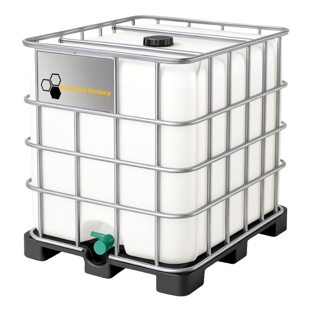 Der 1000 kg IBC-Container kommt auf einer Kunststoffpalette und eignet sich ideal für Imkereien mit hohem Futterbedarf – sauber, sicher und direkt einsatzbereit.