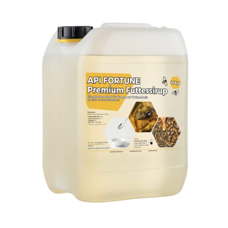 Du suchst einen zuverlässigen Futtersirup Bienen, der Deinen Völkern eine sichere Überwinterung garantiert? Der API FORTUNE 15-75 Futtersirup auf Weizenbasis ist seit über 18 Jahren bewährt. Der 14 kg Kanister enthält eine flüssige Formulierung mit 75 % Zuckeranteil in der Trockenmasse, die ohne Anmischen direkt einsetzbar ist. Die Zusammensetzung mit 15 % Fructose und 67 % Dextroseäquivalent sorgt für eine ausgewogene Energieversorgung. Der HMF-Wert liegt unter 50 ppm, produziert wird in Deutschland unter kontrollierten Bedingungen mit Analysezertifikat. Frei von Pestiziden, Konservierungsstoffen und Allergenen ist dieser Bienen Futtersirup kaufen eine Investition in die Gesundheit Deiner Völker. Der Kanister fasst 14 kg Sirup, was etwa 10,5 kg Kristallzucker entspricht. Diese Menge reicht für mehrere Fütterungsdurchgänge oder die Versorgung mehrerer Völker. Der wiederverschließbare Kanister mit Ausguss macht das Umfüllen in Futterzargen, Eimer oder Futtertaschen einfach. Anders als bei Trockenzucker entfällt das zeitaufwendige Anrühren. Du öffnest den Kanister, füllst den Sirup in Deine Fütterungsvorrichtung und bist fertig. Die Lagerfähigkeit von bis zu 18 Monaten bei kühler, trockener und lichtgeschützter Aufbewahrung gibt Dir Flexibilität bei der Bevorratung.