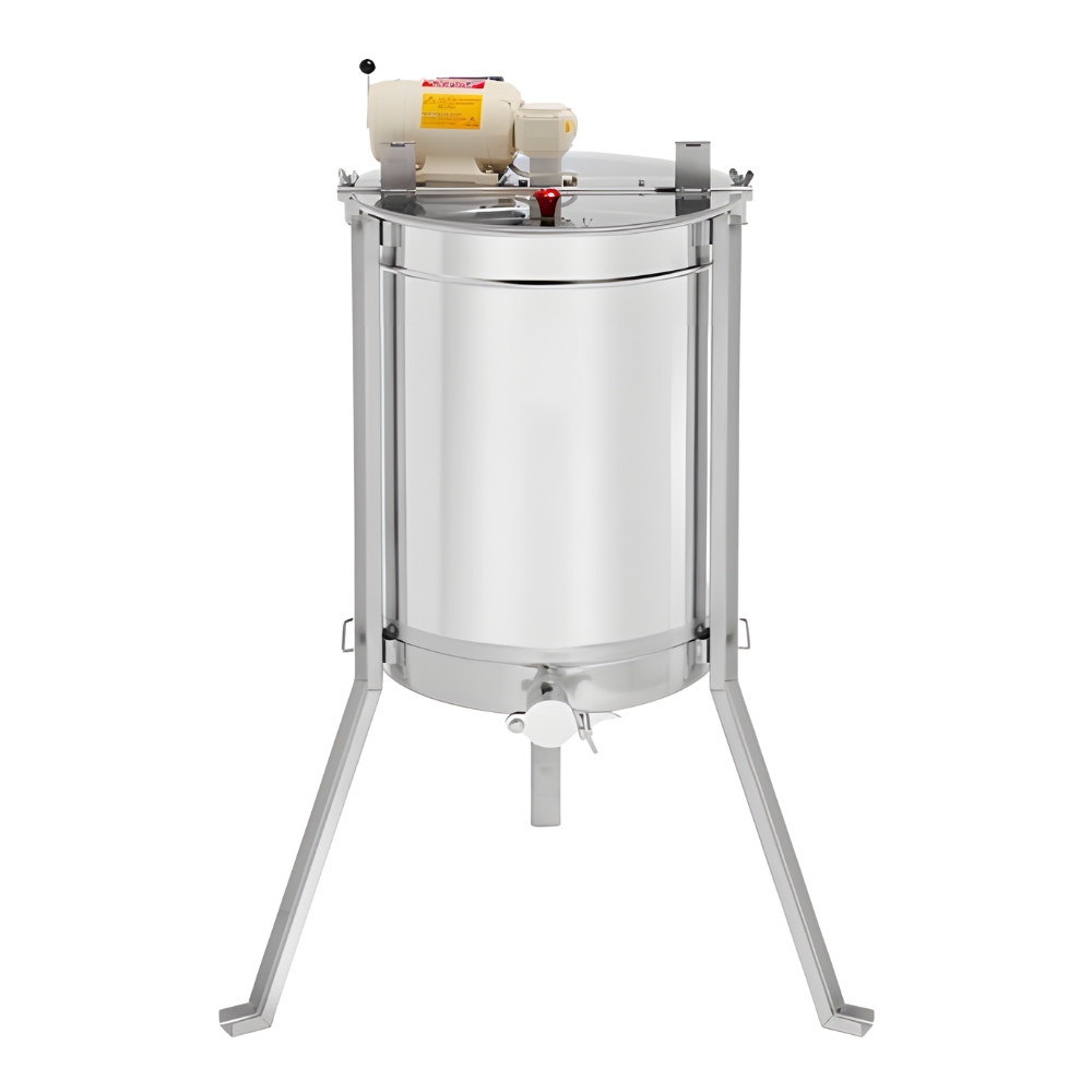 Besonders hervorzuheben: Der Wabenkorb kommt ohne Mittelachse aus – das erleichtert die Handhabung und ermöglicht das beidseitige Ausschleudern der Rähmchen ohne Umdrehen. Ein weiterer Pluspunkt ist der bodenbündig angeschweißte Quetschhahn, der eine restlose Honigentnahme ermöglicht.