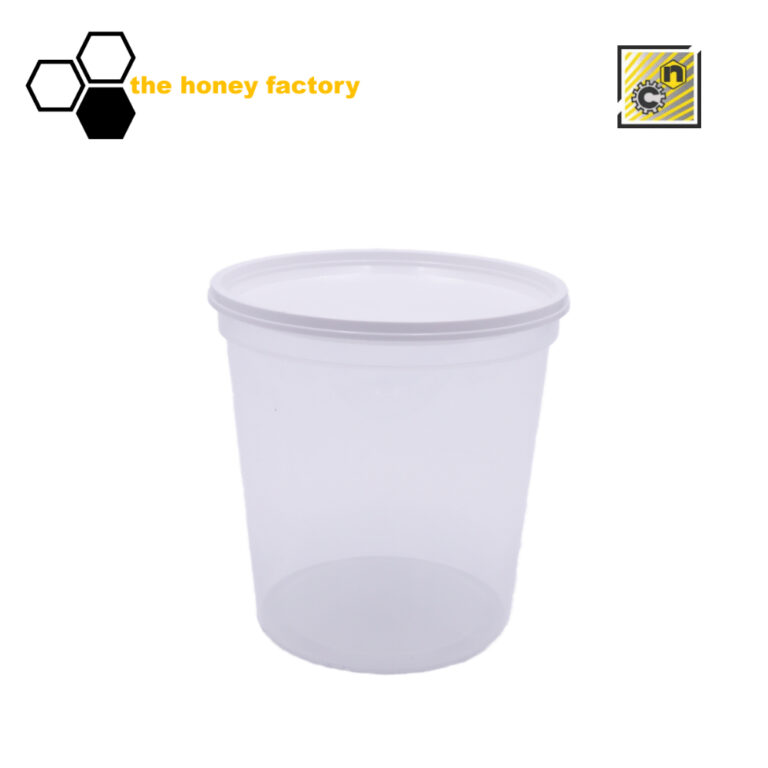 Lebensmittelechter, transparenter Honigeimer mit weißem Deckel für eine Füllmenge bis zu 1 KG.