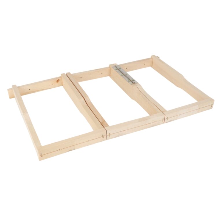 Wenn du auf der Suche nach einer klugen Lösung bist, um Brutrahmen platzsparend zu transportieren oder zu lagern, ist das Klapprähmchen für BiVo-Box® genau das richtige Werkzeug für deine Imkerei. Das Klapprähmchen überzeugt durch seine durchdachte Mechanik: Drei über Scharniere verbundene Fächer lassen sich kompakt zusammenklappen – ideal für Transport, Zwischenlagerung oder Notumsetzungen. Jedes Fach ist so konstruiert, dass es einzeln doppelt gedrahtet werden kann. Das macht das Handling besonders stabil, auch bei feuchtwarmer Umgebung in der Beute. Die integrierten Hoffmannseiten garantieren Abstand und Stabilität im Betrieb, während Drahtrillen an Ober- und Unterträgern eine präzise Führung der Drahtung ermöglichen – sowohl im ausgeklappten Zustand im Brutraum als auch im eingeklappten Zustand in deiner BiVo-Box®.