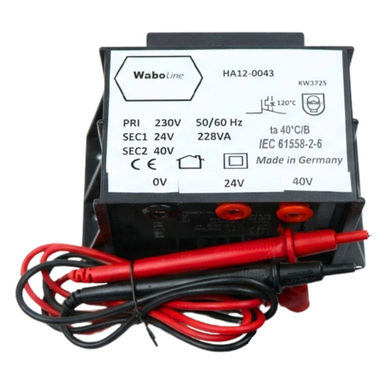 Der Trafolöter für Mittelwände arbeitet mit einer primären Eingangsspannung von 230V bei 50/60 Hz. Die beiden sekundären Ausgänge liefern wahlweise 24V oder 40V, sodass du sowohl bei dünnen Drähten als auch bei stärkeren Rahmenkonstruktionen die optimale Temperatur erreichst. Die Messleitungen mit roten und schwarzen Anschlusskabeln sorgen für sichere Stromübertragung beim Löten. Die roten Anschlüsse an der Gerätefront zeigen dir auf einen Blick, welche Ausgangsspannung du gerade nutzt.