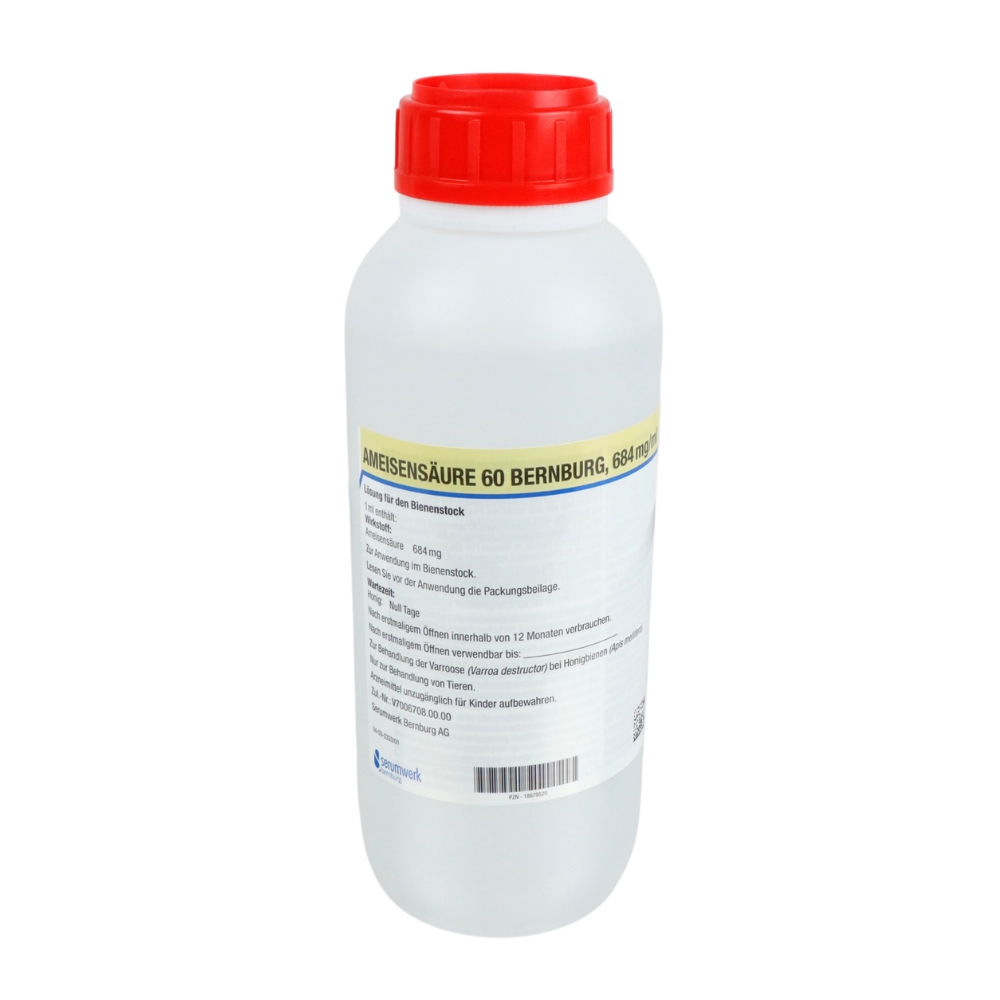 Die Ameisensäure 60% ad us.vet – 1 Liter vom Serumwerk Bernburg ist ein zuverlässiges Mittel zur direkten Behandlung von Bienenvölkern nach der letzten Honigernte. Die Lösung ist gebrauchsfertig, wird ad us. vet. angewendet und eignet sich besonders für die Anwendung mit geeigneten Applikatoren zur Verdunstung, z. B. mit Nassenheider Verdunstern.