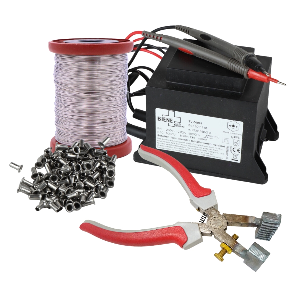 Das Herzstück des Sets ist der leistungsstarke Trafolöter Biene+ MAXPOWER 165VA. Dank seiner Schaltstufen für Edelstahl und verzinnten Draht bist du flexibel und kannst Mittelwände sicher und stabil befestigen. Mit dem robusten, vergossenen Gehäuse und der Temperaturabsicherung arbeitest du zuverlässig und sicher.